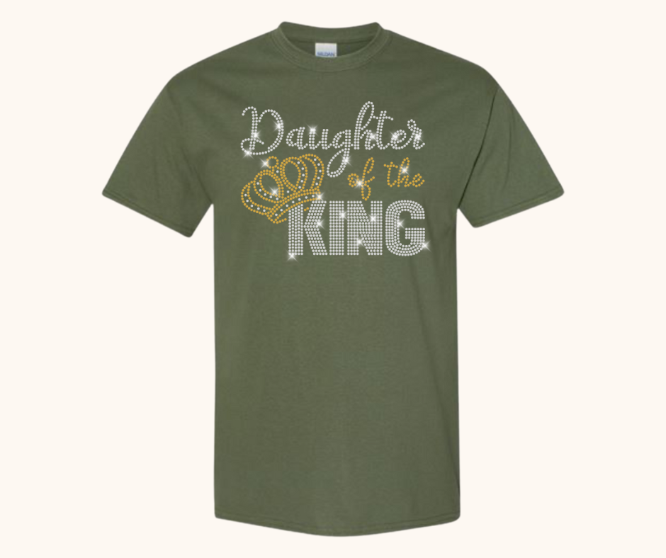 This stunning rhinestone design declares what heaven already knows: you are royalty. The “Daughter of the King” tee sparkles with crystal and gold rhinestones, adding shine to your spirit and fire to your wardrobe.
