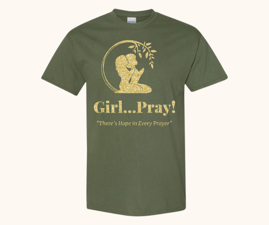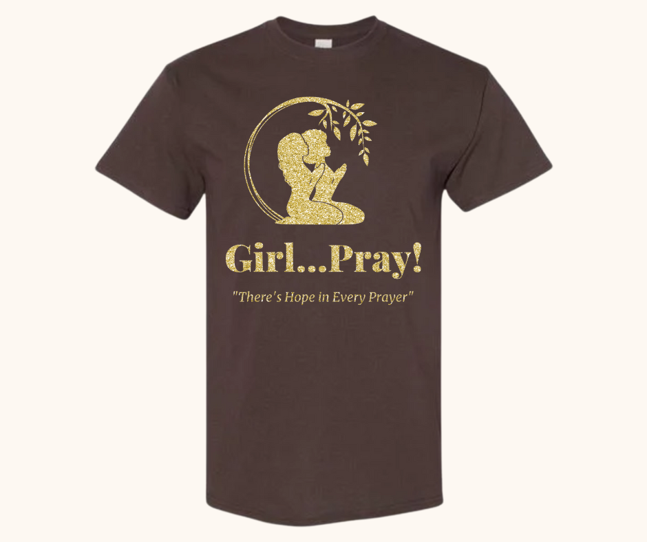 This signature tee features the Girl… Pray! logo in luxe gold foil -a radiant symbol of faith, identity, and intimacy with God. With the powerful reminder that “There’s Hope in Every Prayer,” this shirt is more than merch… it's ministry on your chest.