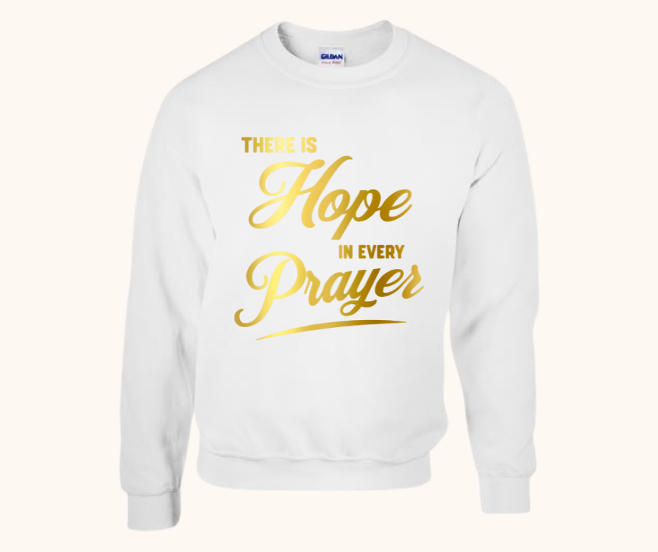 This radiant sweatshirt reminds you that no matter what season you’re in, hope is still alive — right there in every whispered prayer. Dressed in luxe gold vinyl against classic black, it’s a statement of unwavering faith, daily strength, and divine expectation.